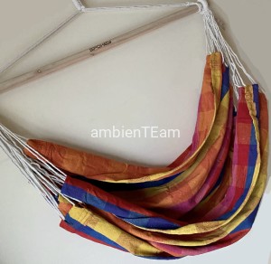 Duży hamak wykonany z drewna i bawełny.